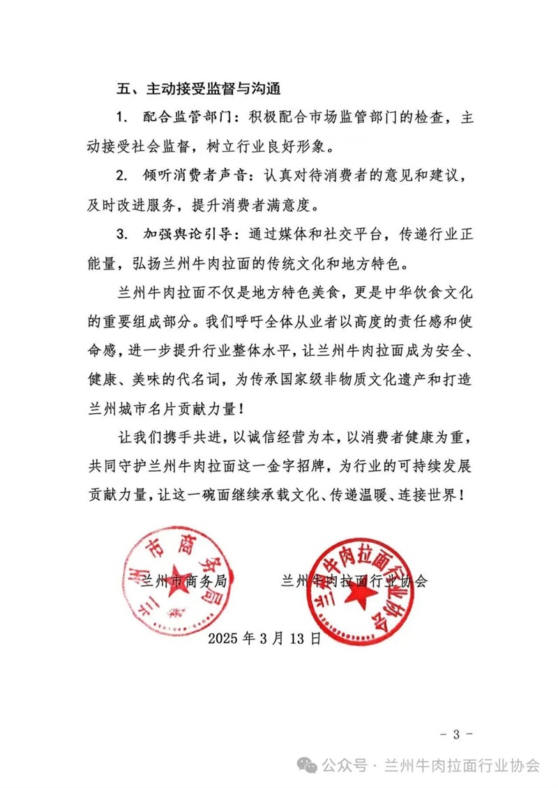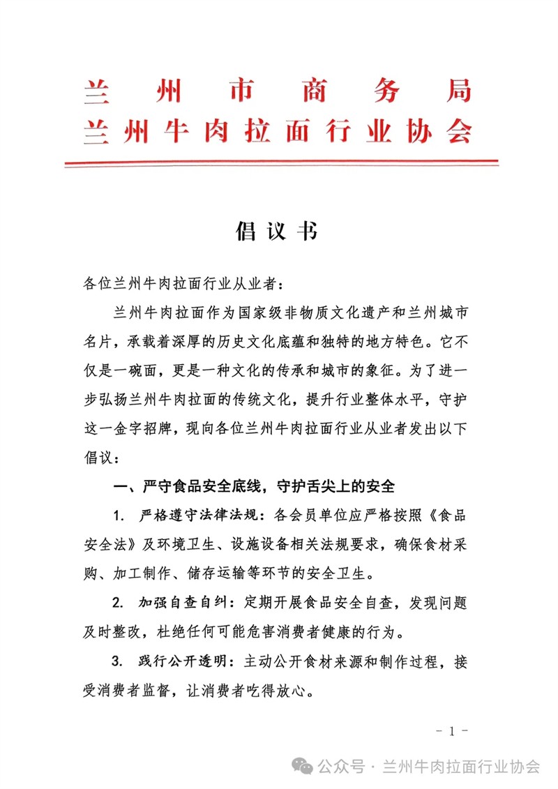 進(jìn)一步弘揚(yáng)蘭州牛肉拉面?zhèn)鹘y(tǒng)文化 提升行業(yè)整體水平 蘭州市商務(wù)局 蘭州牛肉拉面行業(yè)協(xié)會(huì)發(fā)出倡議