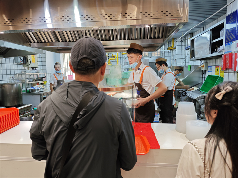 拉面過程暗含力學(xué)巧思:雙手發(fā)力需剛?cè)岵ㄟ^抖動、甩抻將面劑子均勻拉伸,既保持面條內(nèi)部纖維的連續(xù)性,又形成獨特的微孔結(jié)構(gòu),使面條在沸水中迅速成熟,入口彈牙爽滑。這種將物理特性與手工技藝完美結(jié)合的工藝,讓每一根面條都成為承載匠心的藝術(shù)品。