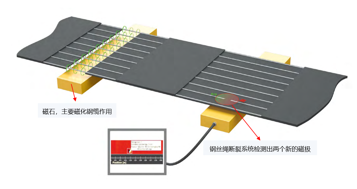 皮帶健康監(jiān)測系統(tǒng)基于霍爾傳感器原理,能夠準確探測輸送帶內鋼芯的斷點位置,在實際運行環(huán)境和工作條件,如果鋼纜上的任何?點發(fā)生損壞(例如切割),就會產生兩個新的磁極,并且立即可見。